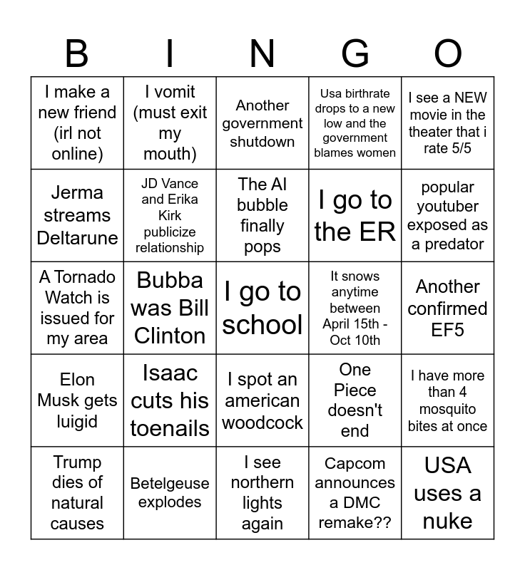 This bingo card has a free space and 24 words: Trump dies of natural causes, Isaac cuts his toenails, The AI bubble finally pops, Capcom announces a DMC remake??, I see a NEW movie in the theater that i rate 5/5, I make a new friend (irl not online), I vomit (must exit my mouth), Another government shutdown, It snows anytime between April 15th - Oct 10th, Another confirmed EF5, A Tornado Watch is issued for my area, JD Vance and Erika Kirk publicize relationship, One Piece doesn't end, I have more than 4 mosquito bites at once, Jerma streams Deltarune, Betelgeuse explodes, I see northern lights again, Usa birthrate drops to a new low and the government blames women, popular youtuber exposed as a predator, Elon Musk gets luigid, Bubba was Bill Clinton, I spot an american woodcock, I go to the ER and USA uses a nuke.