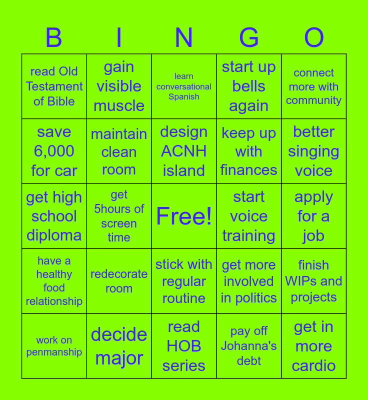 This bingo card has a free space and 24 words: redecorate room, decide major, design ACNH island, work on penmanship, connect more with community, read Old Testament of Bible, save 6,000 for car, gain visible muscle, start voice training, stick with regular routine, keep up with finances, get high school diploma, get more involved in politics, finish WIPs and projects, maintain clean room, pay off Johanna's debt, apply for a job, learn conversational Spanish, better singing voice, get 5hours of screen time, get in more cardio, have a healthy food relationship, start up bells again and read HOB series.
