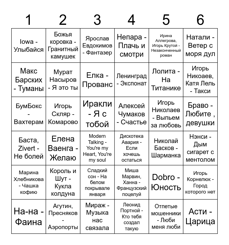This bingo card has 37 words: Dobro - Юность, Миша Марвин, Ханна - Французский поцелуй, Отпетые мошенники - Люби меня люби, Макс Барских - Туманы, Елена Ваенга - Желаю, Игорь Николаев - Выпьем за любовь, Мурат Насыров - Я это ты, Леонид Портной - Кто тебя создал такую, Ирина Аллегрова, Игорь Крутой - Незаконченный роман, На-на - Фаина, Игорь Никоаев, Катя Лель - Такси, Непара - Плачь и смотри, БумБокс - Вахтерам, Иракли - Я с тобой, Натали - Ветер с моря дул, Алексей Чумаков - Счастье, Король и Шут - Кукла колдуна, Ярослав Евдокимов - Фантазер, Браво - Любите , девушки, Игорь Скляр - Комарово, Iowa - Улыбайся, Ленинград - Экспонат, Modern Talking - You're my Heart, You're my soul, Николай Басков - Шарманка, Агутин, Пресняков - Аэропорты, Нэнси - Дым сигарет с ментолом, Божья коровка - Гранитный камушек, Мираж - Музыка нас связала, Игорь Корнелюк - Город которого нет, Сладкий сон - На белом покрывале января, Здравствуй, песня - Синий иней, Дискотека Авария - Если хочешь остаться, Лолита - На Титанике, Марина Хлебникова - Чашка кофию, Баста, Zivert - Не болей, Елка - Прованс and Асти - Царица.