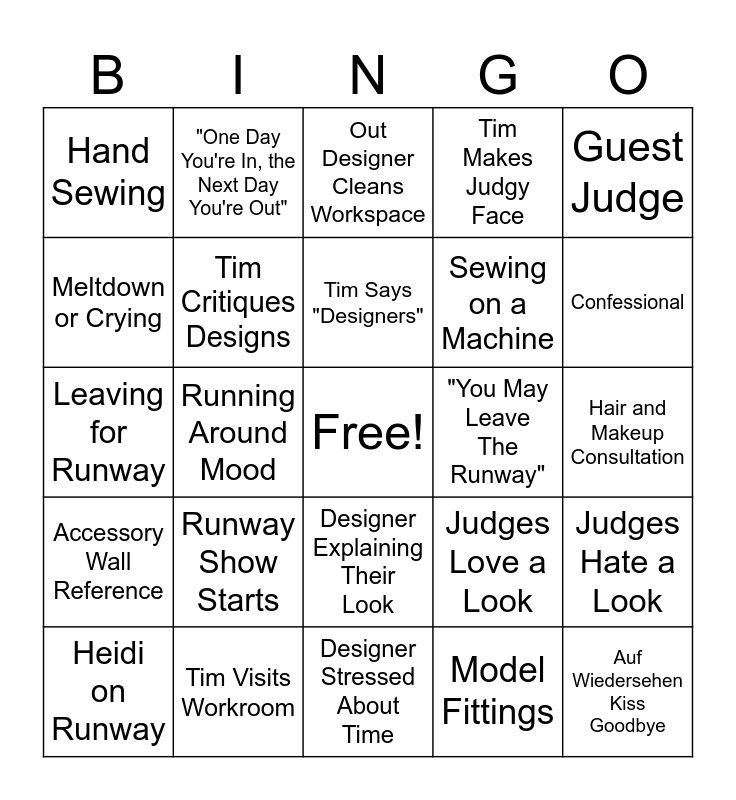 This bingo card has a free space and 24 words: Runway Show Starts, Tim Visits Workroom, Tim Says "Designers", Heidi on Runway, Guest Judge, Hand Sewing, Meltdown or Crying, "One Day You're In, the Next Day You're Out", "You May Leave The Runway", Designer Explaining Their Look, Sewing on a Machine, Leaving for Runway, Judges Love a Look, Judges Hate a Look, Tim Critiques Designs, Model Fittings, Hair and Makeup Consultation, Out Designer Cleans Workspace, Confessional, Running Around Mood, Auf Wiedersehen Kiss Goodbye, Accessory Wall Reference, Tim Makes Judgy Face and Designer Stressed About Time.