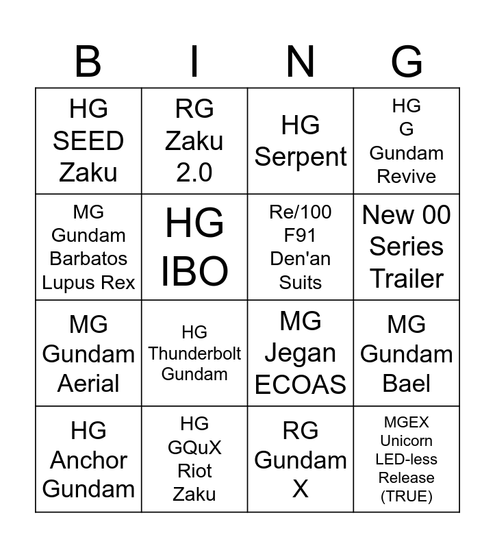 This bingo card has 16 words: HG GQuX Riot Zaku, MG Gundam Bael, HG Serpent, HG SEED Zaku, MG Gundam Aerial, RG Zaku 2.0, MG Jegan ECOAS, RG Gundam X, MG Gundam Barbatos Lupus Rex, HG IBO, HG Anchor Gundam, HG G Gundam Revive, HG Thunderbolt Gundam, New 00 Series Trailer, Re/100 F91 Den'an Suits and MGEX Unicorn LED-less Release (TRUE).