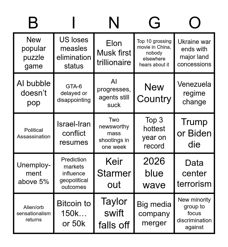 This bingo card has a free space and 24 words: Prediction markets influence geopolitical outcomes, Bitcoin to 150k… or 50k, AI progresses, agents still suck, Alien/orb sensationalism returns, Ukraine war ends with major land concessions, New popular puzzle game, AI bubble doesn’t pop, US loses measles elimination status, Top 3 hottest year on record, Keir Starmer out, New Country, Political Assassination, 2026 blue wave, Data center terrorism, GTA-6 delayed or disappointing, Big media company merger, Trump or Biden die, Elon Musk first trillionaire, Venezuela regime change, Israel-Iran conflict resumes, New minority group to focus discrimination against, Unemploy-ment above 5%, Top 10 grossing movie in China, nobody elsewhere hears about it and Taylor swift falls off.