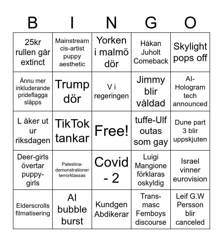 This bingo card has a free space and 41 words: asd, L åker ut ur riksdagen, Någon dör under patriot games 2026, Trump dör, AI bubble burst, Covid - 2, V i regeringen, Signal lämnar Sverige, Skylight pops off, Deer-girls övertar puppy-girls, TikTok tankar, Håkan Juholt Comeback, Leif G.W Persson blir canceled, Dune part 3 blir uppskjuten, tuffe-Ulf outas som gay, Palestina-demonstrationer terrorklassas, Exoborne släpps och tankar direkt, 25kr rullen går extinct, 2a tjej-skate sesh infört på brygget, Yorken i malmö dör, Israel vinner eurovision, Ny “skånerost” från nytt märke, Kundgen Abdikerar, Jimmy blir våldad, Aliens Exist Confirmed, 2-cb blir T-girl lore, Trans-masc Femboys discourse, Vem får säga “tranny” discourse, AI-Hologram tech announced, Major musicartist har AI-låt skandal, Östrogen Looksmaxxing blir poppis, Mainstream cis-artist puppy aesthetic, Elderscrolls filmatisering, Bocken brinner, Luigi Mangione förklaras oskyldig, Ännu mer inkluderande prideflagga släpps, JK Rowling inlagd på sjukhus, vårt fel, Epstein files full leak, nothing happens, Netanyahu down, next genocides lebanon, Erika Kirk gets a show on fox news and Nya könstillhörighetslagen rivs up.