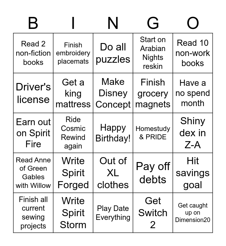 This bingo card has a free space and 24 words: Write Spirit Forged, Write Spirit Storm, Make Disney Concept, Finish all current sewing projects, Read 10 non-work books, Read 2 non-fiction books, Driver's license, Finish embroidery placemats, Homestudy & PRIDE, Out of XL clothes, Finish grocery magnets, Earn out on Spirit Fire, Pay off debts, Hit savings goal, Get a king mattress, Get Switch 2, Shiny dex in Z-A, Do all puzzles, Have a no spend month, Ride Cosmic Rewind again, Get caught up on Dimension20, Read Anne of Green Gables with Willow, Start on Arabian Nights reskin and Play Date Everything.