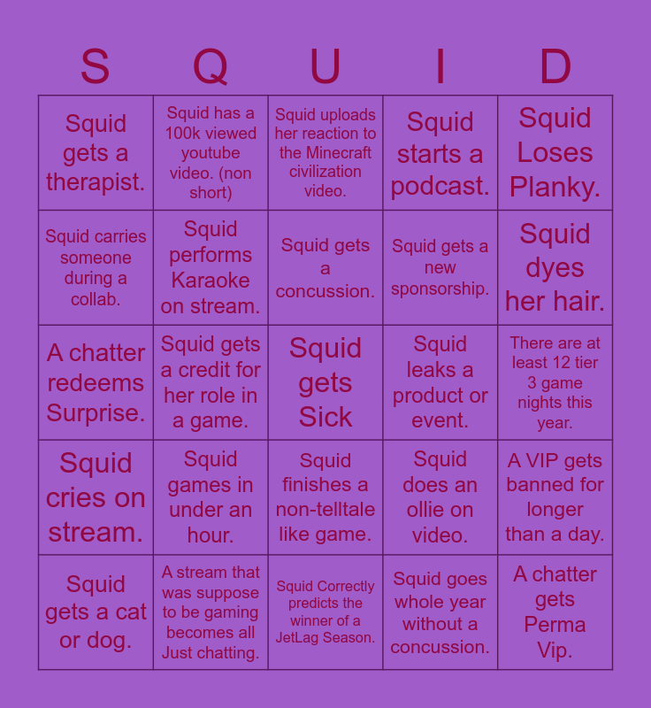 This bingo card has a free space and 24 words: Squid games in under an hour., A stream that was suppose to be gaming becomes all Just chatting., Squid gets a concussion., Squid gets a cat or dog., Squid Loses Planky., Squid gets a therapist., Squid carries someone during a collab., Squid has a 100k viewed youtube video. (non short), Squid leaks a product or event., Squid finishes a non-telltale like game., Squid gets a new sponsorship., A chatter redeems Surprise., Squid does an ollie on video., A VIP gets banned for longer than a day., Squid performs Karaoke on stream., Squid goes whole year without a concussion., There are at least 12 tier 3 game nights this year., Squid uploads her reaction to the Minecraft civilization video., Squid dyes her hair., Squid gets a credit for her role in a game., A chatter gets Perma Vip., Squid cries on stream., Squid starts a podcast. and Squid Correctly predicts the winner of a JetLag Season..