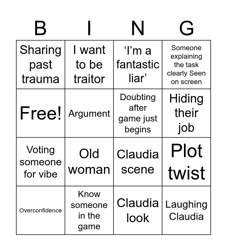 This bingo card has 16 words: Know someone in the game, Plot twist, ‘I’m a fantastic liar’, Sharing past trauma, Voting someone for vibe, I want to be traitor, Claudia scene, Claudia look, Free!, Argument, Overconfidence, Someone explaining the task clearly Seen on screen, Old woman, Hiding their job, Doubting after game just begins and Laughing Claudia.