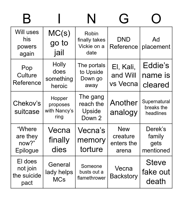 This bingo card has a free space and 29 words: El does not join the suicide pact, Someone gets sent to the void, Hopper proposes with Nancy’s ring, Kali dies, Will uses his powers again, Robin finally takes Vickie on a date, Holly does something heroic, Vecna finally dies, Another analogy, General lady helps MCs, Supernatural breaks the headlines, Steve fake out death, Someone busts out a flamethrower, Vecna Backstory, Eddie’s name is cleared, Mind Flayer returns, Vecna’s memory torture, “Where are they now?” Epilogue, Ad placement, Chekov’s suitcase, New creature enters the arena, Bridge blows up, El, Kali, and Will vs Vecna, Pop Culture Reference, DND Reference, MC(s) go to jail, Derek’s family gets mentioned, The portals to Upside Down go away and Military leave.
