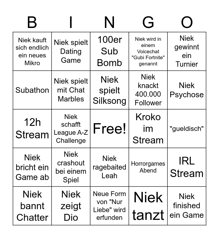 This bingo card has a free space and 24 words: Niek crashout bei einem Spiel, Niek zeigt Dio, Niek spielt Silksong, Niek bannt Chatter, Niek gewinnt ein Turnier, Niek kauft sich endlich ein neues Mikro, Subathon, Niek spielt Dating Game, Kroko im Stream, Niek ragebaited Leah, Niek knackt 400.000 Follower, 12h Stream, Horrorgames Abend, IRL Stream, Niek spielt mit Chat Marbles, Niek tanzt, "gueldisch", 100er Sub Bomb, Niek Psychose, Niek schafft League A-Z Challenge, Niek finished ein Game, Niek bricht ein Game ab, Niek wird in einem Voicechat "Gubi Fortnite" genannt and Neue Form von "Nur Liebe" wird erfunden.