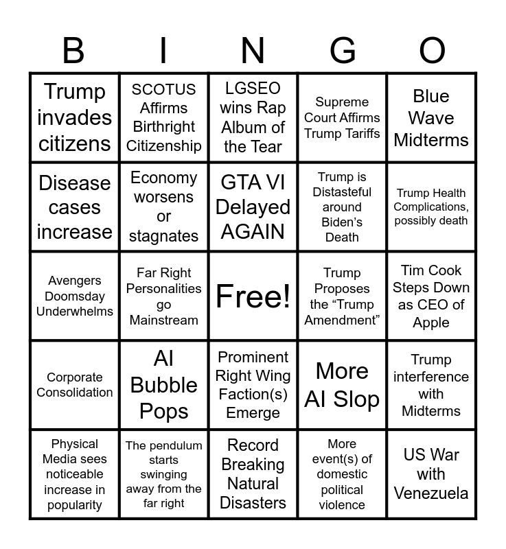 This bingo card has a free space and 24 words: AI Bubble Pops, The pendulum starts swinging away from the far right, GTA VI Delayed AGAIN, Physical Media sees noticeable increase in popularity, Blue Wave Midterms, Trump invades citizens, Disease cases increase, SCOTUS Affirms Birthright Citizenship, Trump Proposes the “Trump Amendment”, Prominent Right Wing Faction(s) Emerge, Trump is Distasteful around Biden’s Death, Avengers Doomsday Underwhelms, More AI Slop, Trump interference with Midterms, Economy worsens or stagnates, More event(s) of domestic political violence, Tim Cook Steps Down as CEO of Apple, LGSEO wins Rap Album of the Tear, Trump Health Complications, possibly death, Far Right Personalities go Mainstream, US War with Venezuela, Corporate Consolidation, Supreme Court Affirms Trump Tariffs and Record Breaking Natural Disasters.