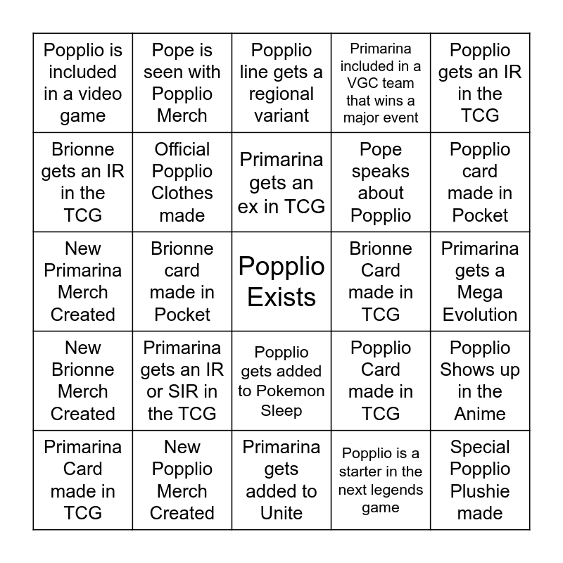 This bingo card has a free space and 24 words: Primarina gets an IR or SIR in the TCG, New Popplio Merch Created, Primarina gets an ex in TCG, Primarina Card made in TCG, Popplio gets an IR in the TCG, Popplio is included in a video game, Brionne gets an IR in the TCG, Pope is seen with Popplio Merch, Brionne Card made in TCG, Popplio gets added to Pokemon Sleep, Pope speaks about Popplio, New Primarina Merch Created, Popplio Card made in TCG, Popplio Shows up in the Anime, Official Popplio Clothes made, Popplio is a starter in the next legends game, Primarina gets a Mega Evolution, Popplio line gets a regional variant, Popplio card made in Pocket, Brionne card made in Pocket, Special Popplio Plushie made, New Brionne Merch Created, Primarina included in a VGC team that wins a major event and Primarina gets added to Unite.