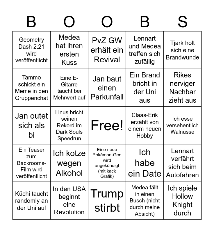 This bingo card has a free space and 24 words: Ich kotze wegen Alkohol, In den USA beginnt eine Revolution, Jan baut einen Parkunfall, Küchi taucht randomly an der Uni auf, Tjark holt sich eine Brandwunde, Geometry Dash 2.21 wird veröffentlicht, Tammo schickt ein Meme in den Gruppenchat, Medea hat ihren ersten Kuss, Claas-Erik erzählt von einem neuen Hobby, Eine neue Pokémon-Gen wird angekündigt (mit kack Grafik), Ein Brand bricht in der Uni aus, Jan outet sich als bi, Ich habe ein Date, Lennart verfährt sich beim Autofahren, Eine E-Gitarre taucht bei Mehrwert auf, Medea fällt in einen Busch (nicht durch meine Absicht), Ich esse versehentlich Walnüsse, PvZ GW erhält ein Revival, Rikes nerviger Nachbar zieht aus, Linus bricht seinen Rekord im Dark Souls Speedrun, Ich spiele Hollow Knight durch, Ein Teaser zum Backrooms-Film wird veröffentlicht, Lennart und Medea treffen sich zufällig and Trump stirbt.
