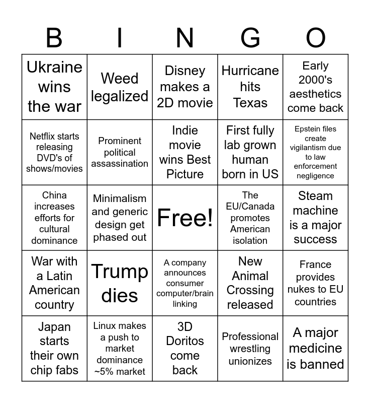 This bingo card has a free space and 24 words: Trump dies, Linux makes a push to market dominance ~5% market, Indie movie wins Best Picture, Japan starts their own chip fabs, Early 2000's aesthetics come back, Ukraine wins the war, Netflix starts releasing DVD's of shows/movies, Weed legalized, The EU/Canada promotes American isolation, A company announces consumer computer/brain linking, First fully lab grown human born in US, China increases efforts for cultural dominance, New Animal Crossing released, France provides nukes to EU countries, Prominent political assassination, Professional wrestling unionizes, Steam machine is a major success, Disney makes a 2D movie, Epstein files create vigilantism due to law enforcement negligence, Minimalism and generic design get phased out, A major medicine is banned, War with a Latin American country, Hurricane hits Texas and 3D Doritos come back.