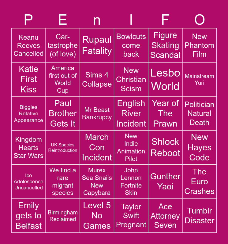 This bingo card has 36 words: John Lennon Fortnite Skin, Murex Sea Snails New Capybara, Taylor Swift Pregnant, Katie First Kiss, Kingdom Hearts Star Wars, English River Incident, America first out of World Cup, Level 5 No Games, Figure Skating Scandal, Gunther Yaoi, Mainstream Yuri, Bowlcuts come back, The Euro Crashes, Paul Brother Gets It, New Christian Scism, Keanu Reeves Cancelled, Ice Adolescence Uncancelled, Year of The Prawn, Biggles Relative Appearance, Rupaul Fatality, Mr Beast Bankrupcy, UK Species Reintroduction, New Indie Animation Pilot, March Con Incident, Shlock Reboot, Car-tastrophe (of love), Lesbo World, Birmingham Reclaimed, Sims 4 Collapse, New Phantom Film, Tumblr Disaster, Emily gets to Belfast, New Hayes Code, Politician Natural Death, We find a rare migrant species and Ace Attorney Seven.