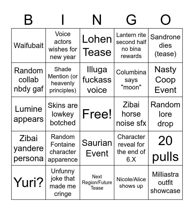 This bingo card has a free space and 24 words: Random Fontaine character apparence, Unfunny joke that made me cringe, Illuga fuckass voice, Yuri?, Sandrone dies (tease), Waifubait, Random collab nbdy gaf, Voice actors wishes for new year, Zibai horse noise sfx, Saurian Event, Columbina says "moon", Lumine appears, Character reveal for the end of 6.X, 20 pulls, Shade Mention (or heavenly principles), Nicole/Alice shows up, Random lore drop, Lohen Tease, Nasty Coop Event, Skins are lowkey botched, Milliastra outfit showcase, Zibai yandere persona, Lantern rite second half no bina rewards and Next Region/Future Tease.