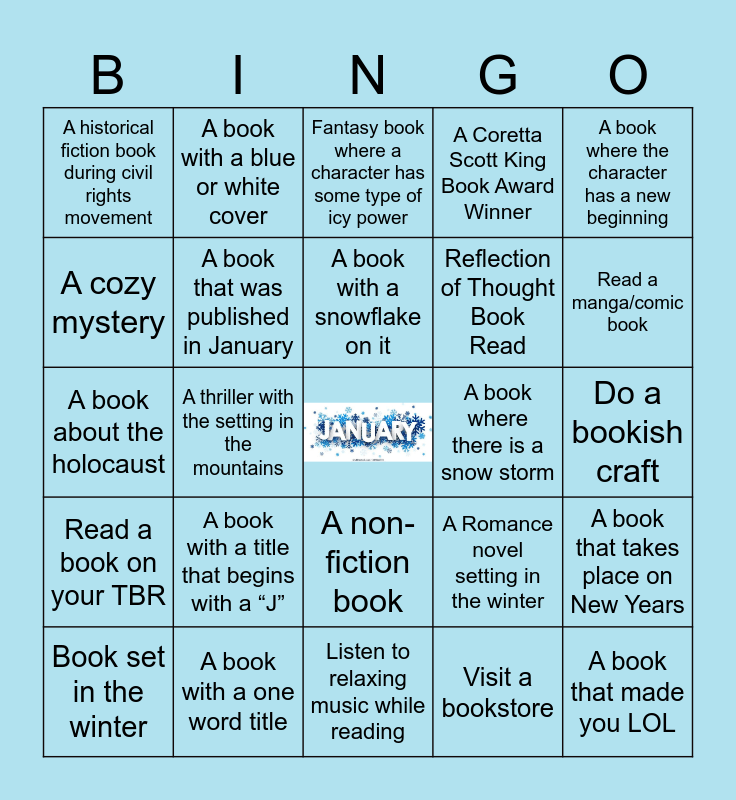 This bingo card has a free space and 24 words: A book with a title that begins with a “J”, A book with a one word title, A book with a snowflake on it, Book set in the winter, A book where the character has a new beginning, A historical fiction book during civil rights movement, A cozy mystery, A book with a blue or white cover, A book where there is a snow storm, A non-fiction book, Reflection of Thought Book Read, A book about the holocaust, A Romance novel setting in the winter, A book that takes place on New Years, A book that was published in January, Visit a bookstore, Do a bookish craft, Fantasy book where a character has some type of icy power, Read a manga/comic book, A thriller with the setting in the mountains, A book that made you LOL, Read a book on your TBR, A Coretta Scott King Book Award Winner and Listen to relaxing music while reading.