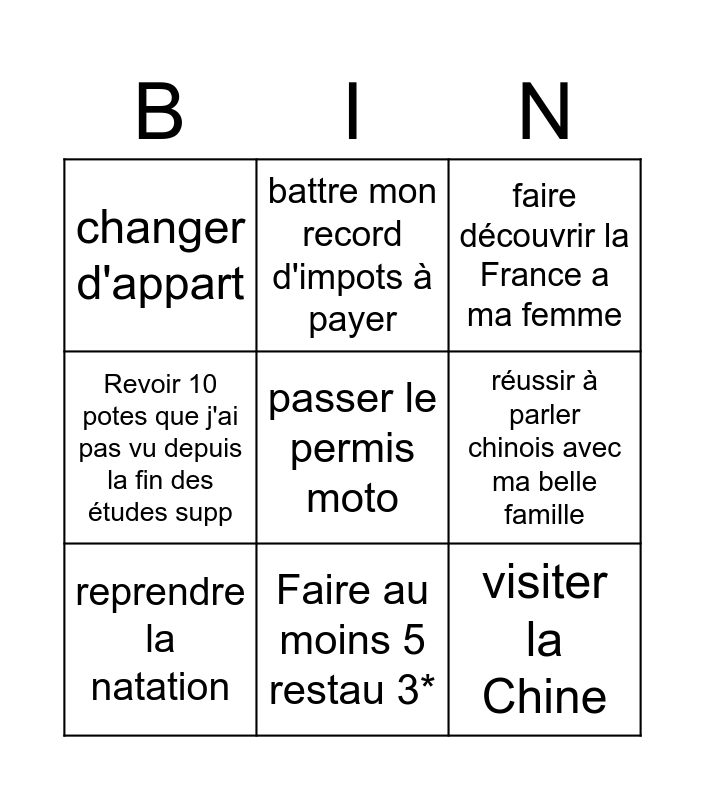 This bingo card has a free space and 8 words: réussir à parler chinois avec ma belle famille, faire découvrir la France a ma femme, battre mon record d'impots à payer, reprendre la natation, changer d'appart, visiter la Chine, Revoir 10 potes que j'ai pas vu depuis la fin des études supp and Faire au moins 5 restau 3*.