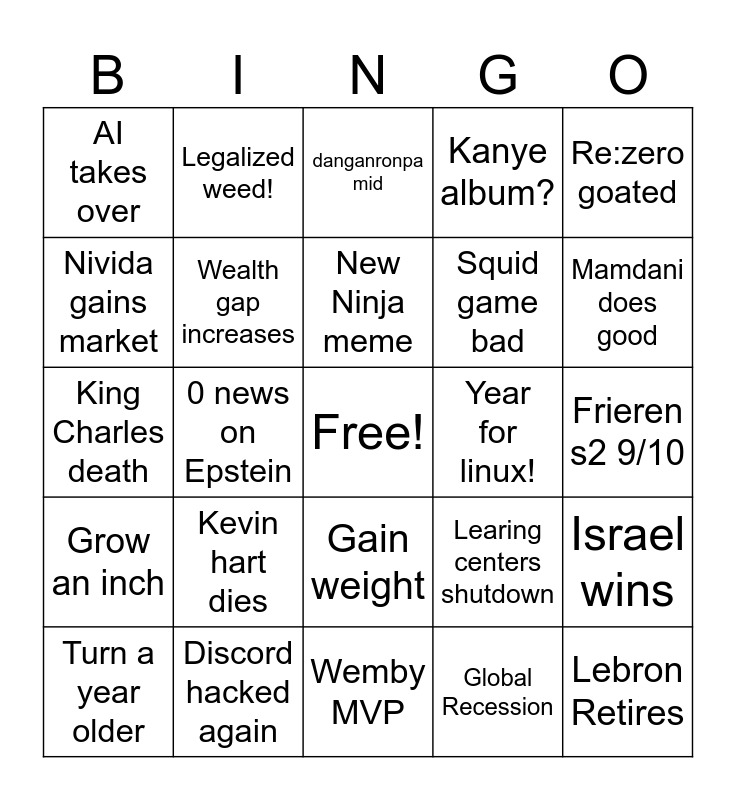 This bingo card has a free space and 24 words: Kevin hart dies, Discord hacked again, New Ninja meme, Turn a year older, Re:zero goated, AI takes over, Nivida gains market, Legalized weed!, Year for linux!, Gain weight, Squid game bad, King Charles death, Learing centers shutdown, Israel wins, Wealth gap increases, Global Recession, Frieren s2 9/10, danganronpa mid, Mamdani does good, 0 news on Epstein, Lebron Retires, Grow an inch, Kanye album? and Wemby MVP.