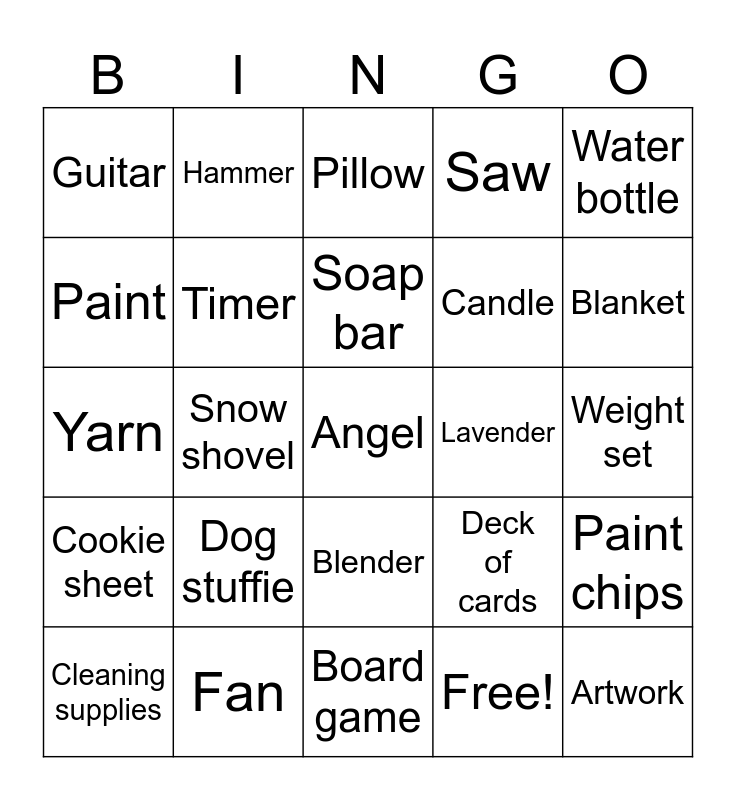 This bingo card has 30 words: Fan, Pitcher plant, Snow shovel, Humidifier, Guitar, Pillow, Timer, Blender, Lavender, Board game, Weight set, Angel, Free!, Artwork, Blanket, Coffee maker, Deck of cards, Cookie sheet, Dog stuffie, Water bottle, Yarn, Leopard gecko, Hammer, Candle, Paint, Saw, Paint chips, Cleaning supplies, Soap bar and Teapot.