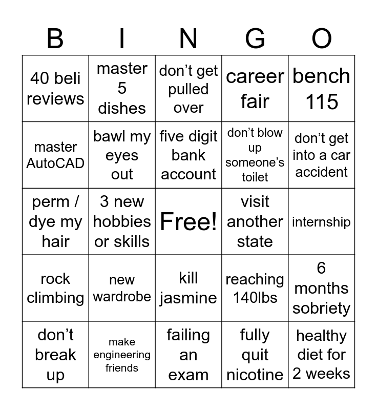 This bingo card has a free space and 24 words: don’t break up, new wardrobe, five digit bank account, fully quit nicotine, bench 115, 40 beli reviews, master 5 dishes, don’t get pulled over, visit another state, internship, perm / dye my hair, bawl my eyes out, reaching 140lbs, 6 months sobriety, master AutoCAD, make engineering friends, failing an exam, career fair, don’t get into a car accident, rock climbing, 3 new hobbies or skills, kill jasmine, don’t blow up someone’s toilet and healthy diet for 2 weeks.