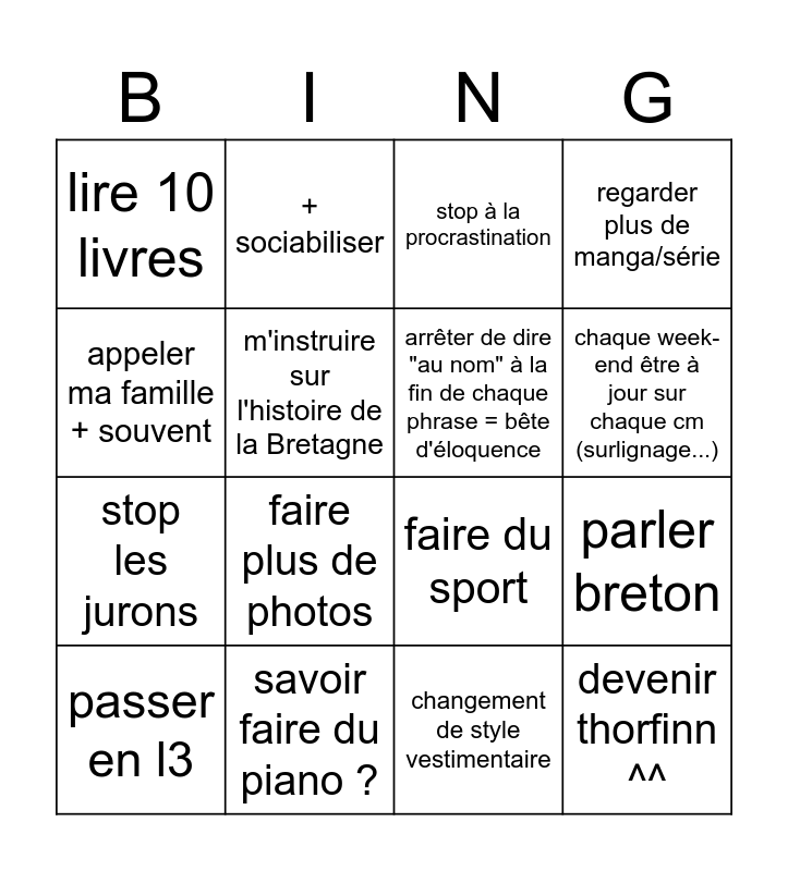 This bingo card has 16 words: savoir faire du piano ?, parler breton, stop à la procrastination, lire 10 livres, stop les jurons, + sociabiliser, faire du sport, changement de style vestimentaire, appeler ma famille + souvent, m'instruire sur l'histoire de la Bretagne, passer en l3, regarder plus de manga/série, faire plus de photos, chaque week-end être à jour sur chaque cm (surlignage...), arrêter de dire "au nom" à la fin de chaque phrase = bête d'éloquence and devenir thorfinn ^^.