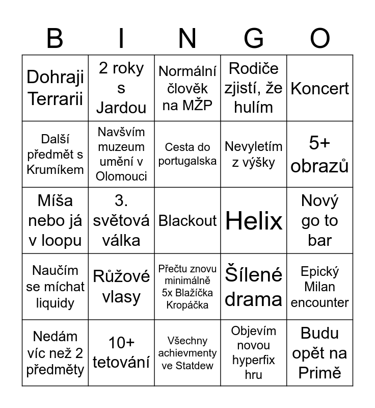 This bingo card has a free space and 24 words: Růžové vlasy, 10+ tetování, Cesta do portugalska, Nedám víc než 2 předměty, Koncert, Dohraji Terrarii, Další předmět s Krumíkem, 2 roky s Jardou, Helix, Přečtu znovu minimálně 5x Blažíčka Kropáčka, Nevyletím z výšky, Míša nebo já v loopu, Šílené drama, Epický Milan encounter, Navšvím muzeum umění v Olomouci, Objevím novou hyperfix hru, Nový go to bar, Normální člověk na MŽP, 5+ obrazů, 3. světová válka, Budu opět na Primě, Naučím se míchat liquidy, Rodiče zjistí, že hulím and Všechny achievmenty ve Statdew.
