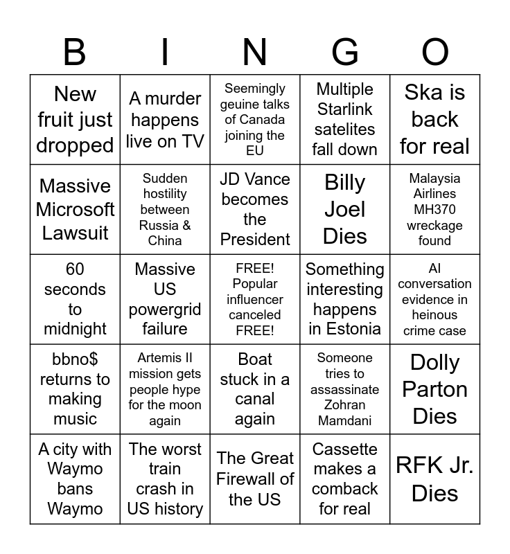 This bingo card has a free space and 24 words: Artemis II mission gets people hype for the moon again, The worst train crash in US history, JD Vance becomes the President, A city with Waymo bans Waymo, Ska is back for real, New fruit just dropped, Massive Microsoft Lawsuit, A murder happens live on TV, Something interesting happens in Estonia, Boat stuck in a canal again, Billy Joel Dies, 60 seconds to midnight, Someone tries to assassinate Zohran Mamdani, Dolly Parton Dies, Sudden hostility between Russia & China, Cassette makes a comback for real, AI conversation evidence in heinous crime case, Seemingly geuine talks of Canada joining the EU, Malaysia Airlines MH370 wreckage found, Massive US powergrid failure, RFK Jr. Dies, bbno$ returns to making music, Multiple Starlink satelites fall down and The Great Firewall of the US.