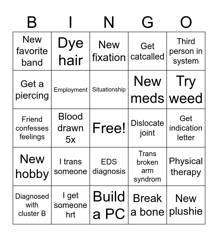 This bingo card has a free space and 24 words: I trans someone, I get someone hrt, Situationship, Diagnosed with cluster B, Third person in system, New favorite band, Get a piercing, Dye hair, Dislocate joint, EDS diagnosis, New meds, Friend confesses feelings, Trans broken arm syndrom, Physical therapy, Employment, Break a bone, Get indication letter, New fixation, Try weed, Blood drawn 5x, New plushie, New hobby, Get catcalled and Build a PC.