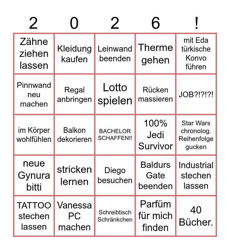 This bingo card has a free space and 24 words: stricken lernen, Vanessa PC machen, Lotto spielen, TATTOO stechen lassen, mit Eda türkische Konvo führen, Zähne ziehen lassen, Pinnwand neu machen, Kleidung kaufen, 100% Jedi Survivor, Diego besuchen, Rücken massieren, im Körper wohlfühlen, Baldurs Gate beenden, Industrial stechen lassen, Regal anbringen, Parfüm für mich finden, Star Wars chronolog. Reihenfolge gucken, Leinwand beenden, JOB?!?!?!, Balkon dekorieren, 40 Bücher., neue Gynura bitti, Therme gehen and Schreibtisch Schränkchen.