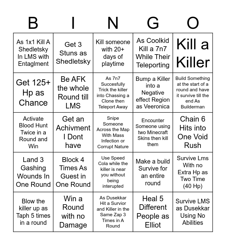 This bingo card has 28 words: Survive Lms With no Extra Hp as Two Time (40 Hp), Win as killer in a full lobby, Bump a Killer into a Negative effect Region as Veeronica, Heal 5 Different People as Elliot, Get 125+ Hp as Chance, Kill someone with 20+ days of playtime, Get 3 Stuns as Shedletsky, Land 3 Gashing Wounds In One Round, Encounter Someone using two Minecraft Skins then kill them, Blow the killer up as Taph 5 times in a round, Activate Blood Hunt Twice in a Round and Win, As Coolkid Kill a 7n7 While Their Teleporting, Win a Round with no Damage, As Dusekkar Hit a Survior and Killer in the Same Zap 3 Times in A Round, Build Something at the start of a round and have it survive till the end As Builderman, Win a round as killer when there are 5 Sentinals, Block 4 Times As Guest in One Round, Be AFK the whole Round till LMS, As 7n7 Succesfully Trick the killer into Chassing a Clone then Teleport Away, Use Speed Cola while the killer is near you without being interupted, As 1x1 Kill A Shedletsky In LMS with Entaglment, Survive LMS as Dusekkar Using No Abilities, Snipe Someone Across the Map With Mass Infection or Corrupt Nature, Get an Achivment I Dont have, Chain 6 Hits into One Void Rush, Make a build Survive for an entire round, Kill a Killer and Kill Someone with a Mass Infection From Across The Map.