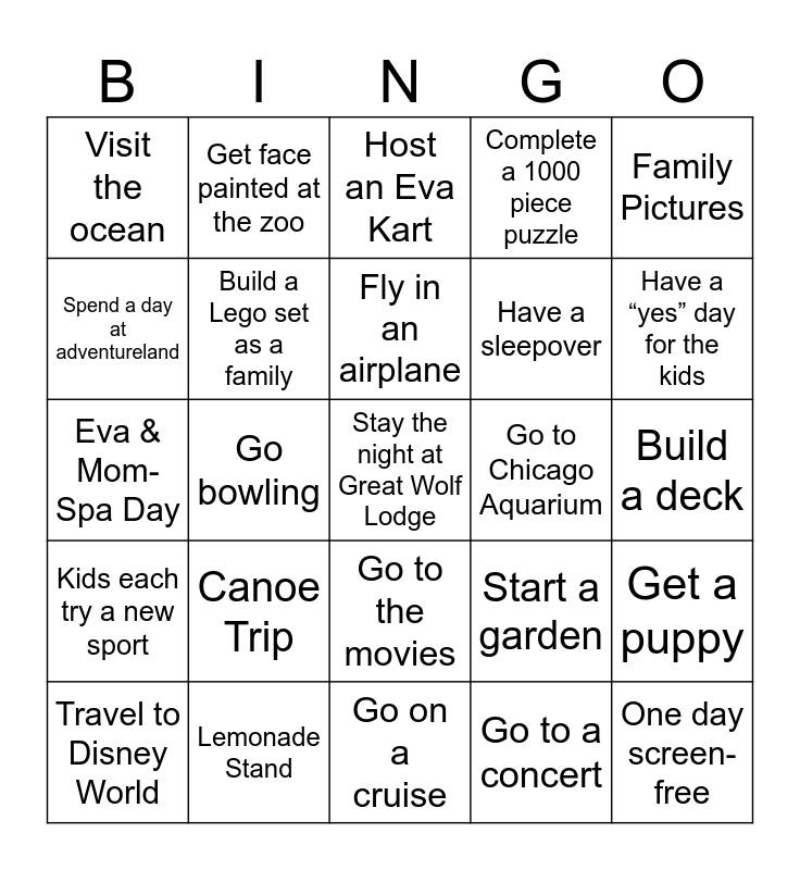 This bingo card has a free space and 24 words: Canoe Trip, Lemonade Stand, Fly in an airplane, Travel to Disney World, Family Pictures, Visit the ocean, Spend a day at adventureland, Get face painted at the zoo, Go to Chicago Aquarium, Go to the movies, Have a sleepover, Eva & Mom- Spa Day, Start a garden, Get a puppy, Build a Lego set as a family, Go to a concert, Build a deck, Host an Eva Kart, Have a “yes” day for the kids, Go bowling, One day screen-free, Kids each try a new sport, Complete a 1000 piece puzzle and Go on a cruise.