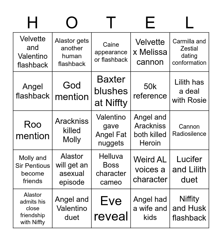 This bingo card has a free space and 24 words: Alastor will get an asexual episode, Angel and Valentino duet, Baxter blushes at Niffty, Alastor admits his close friendship with Niffty, Carmilla and Zestial dating conformation, Velvette and Valentino flashback, Angel flashback, Alastor gets another human flashback, Angel and Arackniss both killed Heroin, Helluva Boss character cameo, 50k reference, Roo mention, Weird AL voices a character, Lucifer and Lilith duet, God mention, Angel had a wife and kids, Cannon Radiosilence, Caine appearance or flashback, Lilith has a deal with Rosie, Arackniss killed Molly, Niffity and Husk flashback, Molly and Sir Pentious become friends, Velvette x Melissa cannon and Eve reveal.