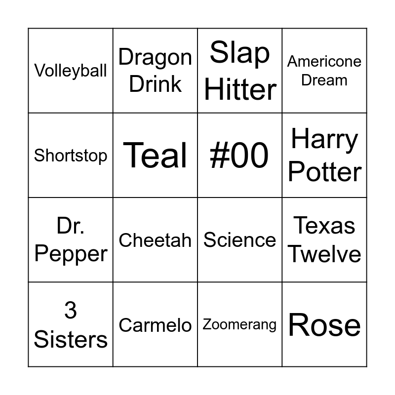 This bingo card has 24 words: White Cheddar Cheese Its, Blonde, Harry Potter, Fried Chicken, Shortstop, Volleyball, Teal, Dragon Drink, Carmelo, Softball, Dr. Pepper, Science, Christmas, Chick-Fil-A, #00, Mango, Zoomerang, Slap Hitter, Cheetah, Texas Twelve, 3 Sisters, Rose, Americone Dream and Kindog.