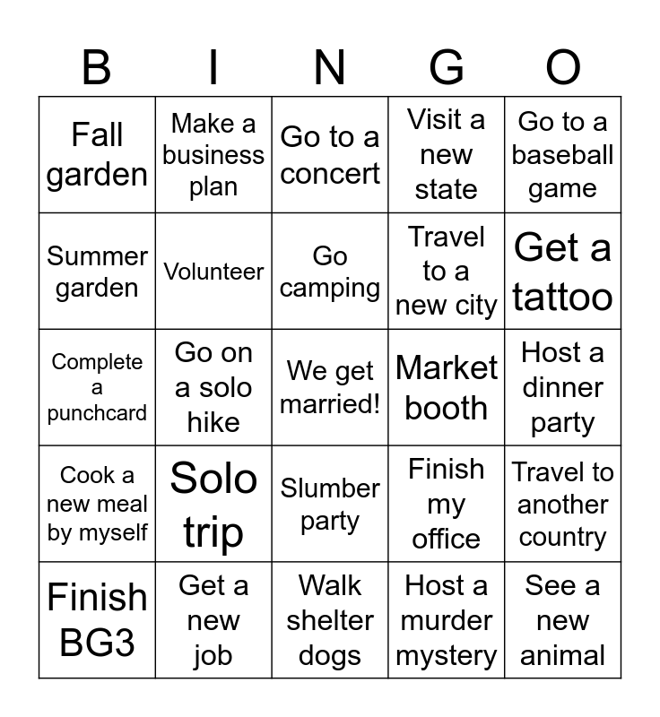 This bingo card has a free space and 24 words: Solo trip, Get a new job, Go camping, Finish BG3, Go to a baseball game, Fall garden, Summer garden, Make a business plan, Market booth, Slumber party, Travel to a new city, Complete a punchcard, Finish my office, Travel to another country, Volunteer, Host a murder mystery, Host a dinner party, Go to a concert, Get a tattoo, Go on a solo hike, See a new animal, Cook a new meal by myself, Visit a new state and Walk shelter dogs.