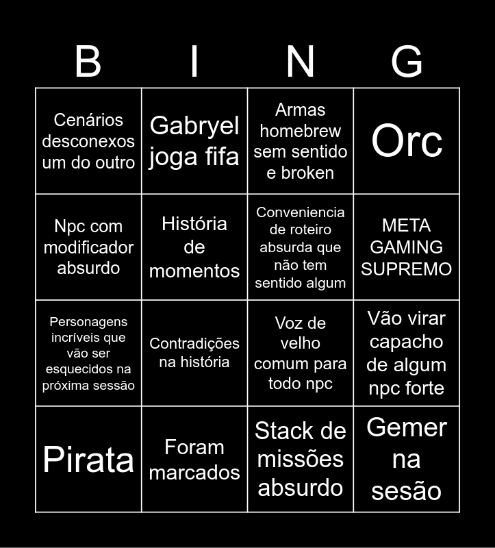 This bingo card has 16 words: Foram marcados, Vão virar capacho de algum npc forte, Armas homebrew sem sentido e broken, Cenários desconexos um do outro, Personagens incríveis que vão ser esquecidos na próxima sessão, Gabryel joga fifa, Voz de velho comum para todo npc, Stack de missões absurdo, Npc com modificador absurdo, História de momentos, Pirata, Orc, Contradições na história, META GAMING SUPREMO, Conveniencia de roteiro absurda que não tem sentido algum and Gemer na sesão.