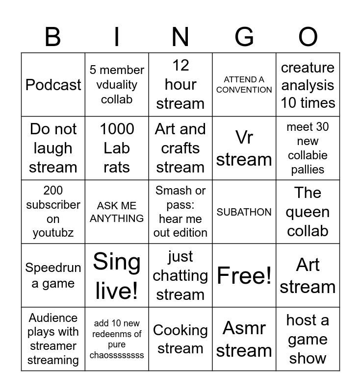 This bingo card has 25 words: Sing live!, Cooking stream, Art and crafts stream, Audience plays with streamer streaming, creature analysis 10 times, Podcast, Do not laugh stream, 5 member vduality collab, SUBATHON, just chatting stream, Vr stream, 200 subscriber on youtubz, Free!, Art stream, 1000 Lab rats, host a game show, The queen collab, 12 hour stream, meet 30 new collabie pallies, ASK ME ANYTHING, Smash or pass: hear me out edition, add 10 new redeenms of pure chaossssssss, Speedrun a game, ATTEND A CONVENTION and Asmr stream.