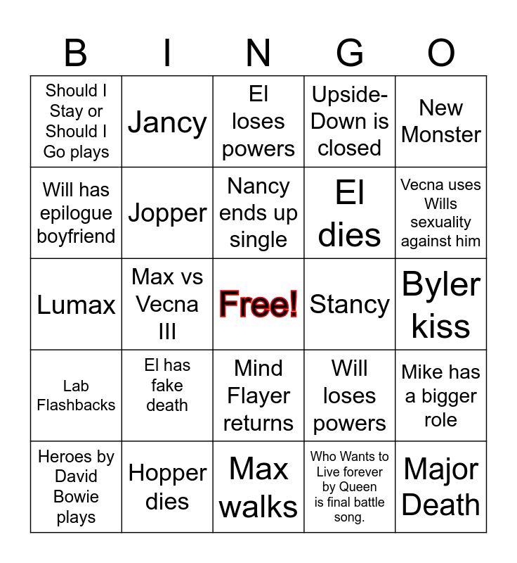 This bingo card has a free space and 24 words: El has fake death, Hopper dies, Nancy ends up single, Heroes by David Bowie plays, New Monster, Should I Stay or Should I Go plays, Will has epilogue boyfriend, Jancy, Stancy, Mind Flayer returns, El dies, Lumax, Will loses powers, Mike has a bigger role, Jopper, Who Wants to Live forever by Queen is final battle song., Byler kiss, El loses powers, Vecna uses Wills sexuality against him, Max vs Vecna III, Major Death, Lab Flashbacks, Upside- Down is closed and Max walks.