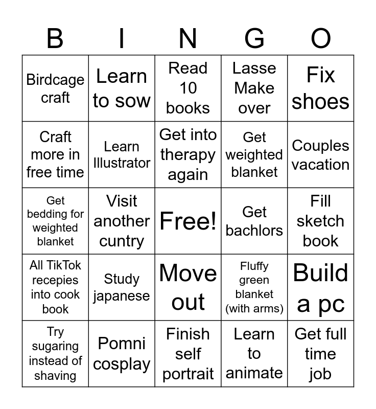 This bingo card has a free space and 24 words: Study japanese, Pomni cosplay, Get into therapy again, Try sugaring instead of shaving, Fix shoes, Birdcage craft, Craft more in free time, Learn to sow, Get bachlors, Move out, Get weighted blanket, Get bedding for weighted blanket, Fluffy green blanket (with arms), Build a pc, Learn Illustrator, Learn to animate, Fill sketch book, Read 10 books, Couples vacation, Visit another cuntry, Get full time job, All TikTok recepies into cook book, Lasse Make over and Finish self portrait.