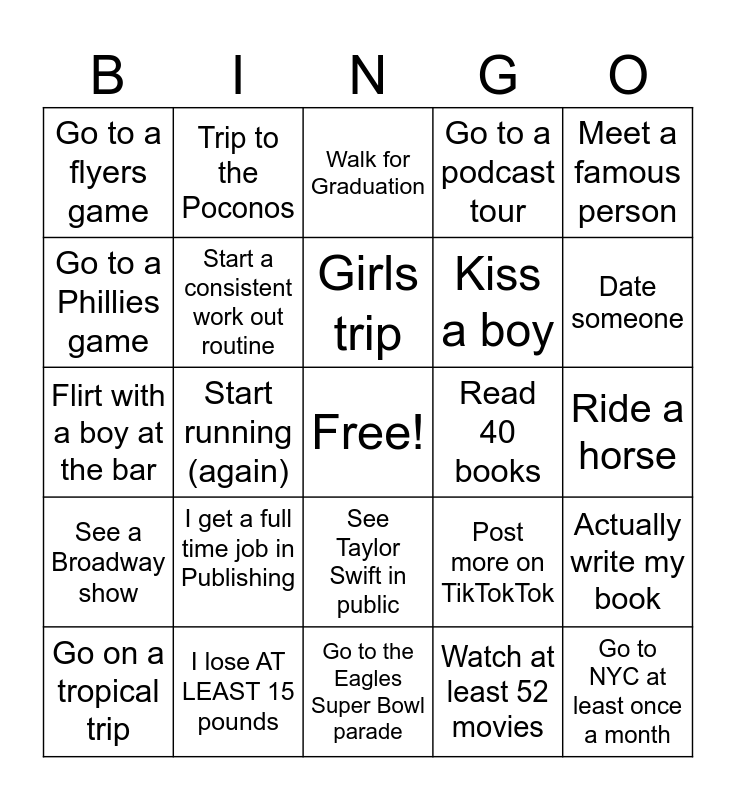 This bingo card has a free space and 24 words: I get a full time job in Publishing, I lose AT LEAST 15 pounds, Girls trip, Go on a tropical trip, Meet a famous person, Go to a flyers game, Go to a Phillies game, Trip to the Poconos, Read 40 books, See Taylor Swift in public, Kiss a boy, Flirt with a boy at the bar, Post more on TikTokTok, Actually write my book, Start a consistent work out routine, Watch at least 52 movies, Ride a horse, Walk for Graduation, Date someone, Start running (again), Go to NYC at least once a month, See a Broadway show, Go to a podcast tour and Go to the Eagles Super Bowl parade.