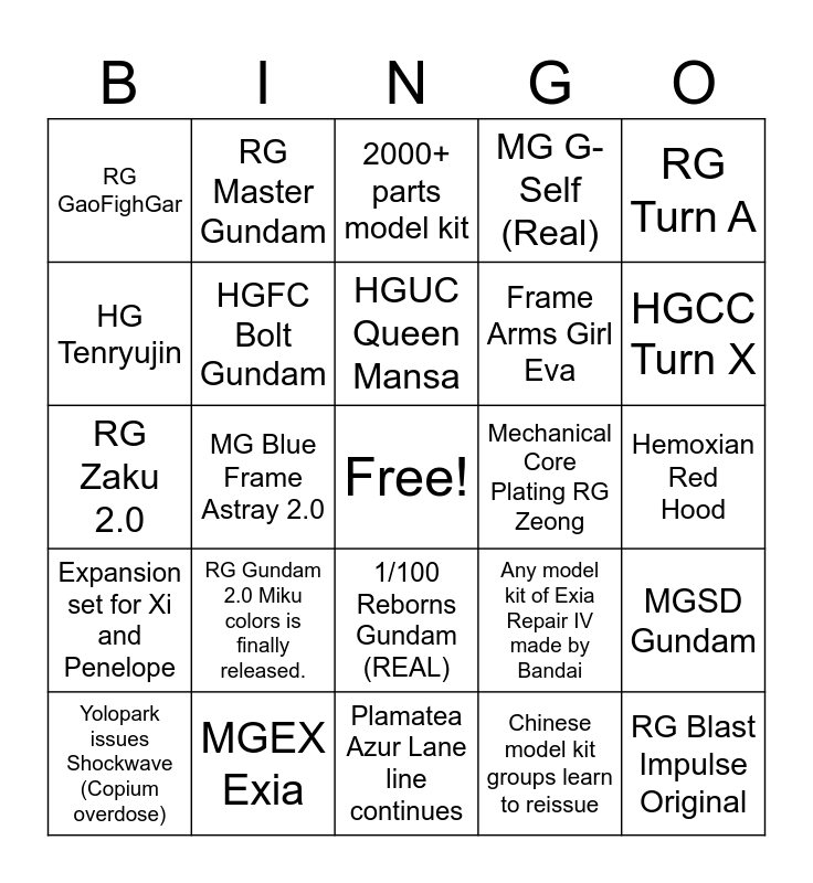 This bingo card has a free space and 24 words: RG Gundam 2.0 Miku colors is finally released., MGEX Exia, HGUC Queen Mansa, Yolopark issues Shockwave (Copium overdose), RG Turn A, RG GaoFighGar, HG Tenryujin, RG Master Gundam, Mechanical Core Plating RG Zeong, 1/100 Reborns Gundam (REAL), Frame Arms Girl Eva, RG Zaku 2.0, Any model kit of Exia Repair IV made by Bandai, MGSD Gundam, HGFC Bolt Gundam, Chinese model kit groups learn to reissue, Hemoxian Red Hood, 2000+ parts model kit, HGCC Turn X, MG Blue Frame Astray 2.0, RG Blast Impulse Original, Expansion set for Xi and Penelope, MG G-Self (Real) and Plamatea Azur Lane line continues.