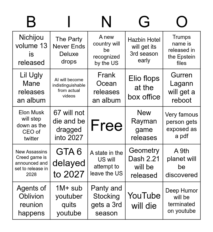 This bingo card has a free space and 24 words: GTA 6 delayed to 2027, 1M+ sub youtuber quits youtube, Frank Ocean releases an album, Agents of Oblivion reunion happens, Trumps name is released in the Epstein files, Nichijou volume 13 is released, Lil Ugly Mane releases an album, The Party Never Ends Deluxe drops, New Rayman game releases, A state in the US will attempt to leave the US, Elio flops at the box office, Elon Musk will step down as the CEO of twitter, Geometry Dash 2.21 will be released, A 9th planet will be discovered, AI will become indistinguishable from actual videos, YouTube will die, Very famous person gets exposed as a pdf, A new country will be recognized by the US, Gurren Lagann will get a reboot, 67 will not die and be dragged into 2027, Deep Humor will be terminated on youtube, New Assassins Creed game is announced and set to release in 2028, Hazbin Hotel will get its 3rd season early and Panty and Stocking gets a 3rd season.