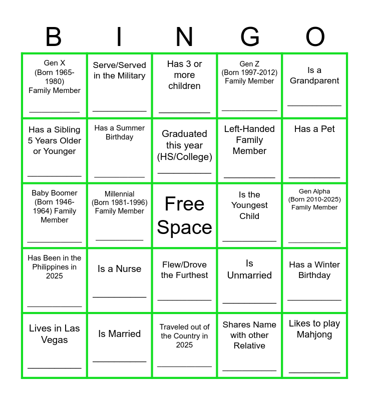 This bingo card has a free space and 24 words: Is a Nurse __________, Is Married __________, Graduated this year (HS/College) __________, Lives in Las Vegas __________, Is a Grandparent ___________, Gen X (Born 1965-1980) Family Member ____________, Has a Sibling 5 Years Older or Younger ___________, Serve/Served in the Military ___________, Is the Youngest Child ___________, Flew/Drove the Furthest ___________, Left-Handed Family Member __________, Baby Boomer (Born 1946-1964) Family Member _____________, Is Unmarried __________, Has a Winter Birthday ___________, Has a Summer Birthday ____________, Shares Name with other Relative ___________, Gen Alpha (Born 2010-2025) Family Member ______________, Has 3 or more children __________, Has a Pet __________, Millennial (Born 1981-1996) Family Member ____________, Likes to play Mahjong __________, Has Been in the Philippines in 2025 _____________, Gen Z (Born 1997-2012) Family Member ______________ and Traveled out of the Country in 2025 _____________.