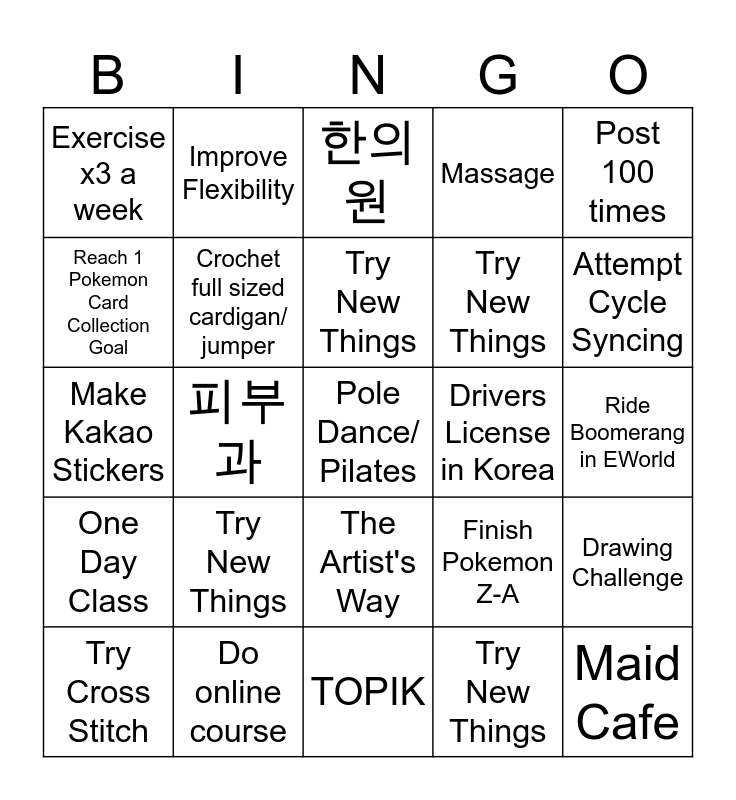 This bingo card has 25 words: Try New Things, TOPIK, Try New Things, Try Cross Stitch, Post 100 times, Exercise x3 a week, Reach 1 Pokemon Card Collection Goal, Improve Flexibility, Drivers License in Korea, The Artist's Way, Try New Things, Make Kakao Stickers, Finish Pokemon Z-A, Drawing Challenge, Crochet full sized cardigan/ jumper, Maid Cafe, Ride Boomerang in EWorld, 한의원, Attempt Cycle Syncing, 피부과, Pole Dance/ Pilates, Do online course, One Day Class, Massage and Try New Things.