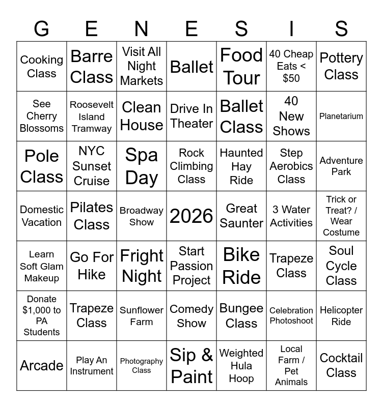 This bingo card has a free space and 62 words: International Vacation, Domestic Vacation, Staycation, NYC Sunset Cruise, Cocktail Class, Helicopter Ride, Pottery Class, Trampoline Park, Roosevelt Island Tramway, Arcade, Ballet, Comedy Show, 40 Cheap Eats < $50, Great Saunter, Joe Hisaishi, Cooking Class, 40 New Shows, Food Tour, Concert, See Cherry Blossoms, Planetarium, Visit All Night Markets, Adventure Park, Broadway Show, Pizza Making Class, Bike Ride, Go For Hike, Go Camping, Step Aerobics Class, Soul Cycle Class, Yoga Class, Sunflower Farm, Local Farm / Pet Animals, Visit National Park, Pole Class, Barre Class, Bungee Class, Trapeze Class, Ballet Class, 3 Water Activities, Drive In Theater, Celebration Photoshoot, Spa Day, Pasta Class, Clean House, Haunted Hay Ride, Fright Night, Play An Instrument, Sip & Paint, Weighted Hula Hoop, Rock Climbing Class, Pilates Class, Adult Gymnastic Class, Trapeze Class, Visit Haunted House, Trick or Treat? / Wear Costume, Start Passion Project, Donate $1,000 to PA Students, Photography Class, Volunteer Animal Shelter, Learn Soft Glam Makeup and Learn 5 Minute Makeup.
