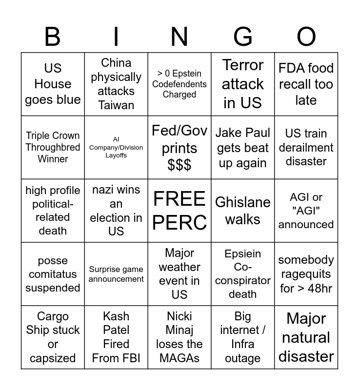 This bingo card has a free space and 39 words: Russia invades another country, political assassination or attempt, Trump Battleship cutbacks, AI Company/Division Layoffs, Cargo Ship stuck or capsized, Major weather event in US, Fed/Gov prints $$$, 3+ trump cabinet/org heads removed, FDA food recall too late, posse comitatus suspended, nazi wins an election in US, Terror attack in US, Major natural disaster, AGI or "AGI" announced, Ghislane walks, Surprise game announcement, Luigi found not guilty, US House goes blue, US Senate goes blue, Epsiein Co-conspirator death, Triple Crown Throughbred Winner, Nicki Minaj loses the MAGAs, Jake Paul gets beat up again, US train derailment disaster, JD Vance Divorce Arc, Erika Kirk remarries, US restarts nuke testing, Putin Dead, US ground invasion of Venezuela, China physically attacks Taiwan, Trump Impeached / 25th amendment, NATO Article 5, > 0 Epstein Codefendents Charged, Kash Patel Fired From FBI, Big internet / Infra outage, Jets->playoffs or Mets->WS, somebody ragequits for > 48hr, high profile political-related death and UN country govt UFO disclosure.