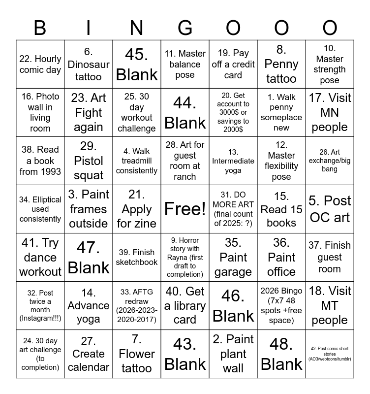 This bingo card has a free space and 49 words: 2026 Bingo (7x7 48 spots +free space), 1. Walk penny someplace new, 2. Paint plant wall, 3. Paint frames outside, 4. Walk treadmill consistently, 5. Post OC art, 6. Dinosaur tattoo, 7. Flower tattoo, 8. Penny tattoo, 9. Horror story with Rayna (first draft to completion), 10. Master strength pose, 11. Master balance pose, 12. Master flexibility pose, 13. Intermediate yoga, 14. Advance yoga, 15. Read 15 books, 16. Photo wall in living room, 17. Visit MN people, 18. Visit MT people, 19. Pay off a credit card, 20. Get account to 3000$ or savings to 2000$, 21. Apply for zine, 22. Hourly comic day, 23. Art Fight again, 24. 30 day art challenge (to completion), 25. 30 day workout challenge, 26. Art exchange/big bang, 27. Create calendar, 28. Art for guest room at ranch, 29. Pistol squat, 30. Consistent yoga schedule, 31. DO MORE ART (final count of 2025: ?), 32. Post twice a month (Instagram!!!), 33. AFTG redraw (2026-2023-2020-2017), 34. Elliptical used consistently, 35. Paint garage, 36. Paint office, 37. Finish guest room, 38. Read a book from 1993, 39. Finish sketchbook, 40. Get a library card, 41. Try dance workout, 42. Post comic short stories (AO3/webtoons/tumblr), 43. Blank, 44. Blank, 45. Blank, 46. Blank, 47. Blank and 48. Blank.