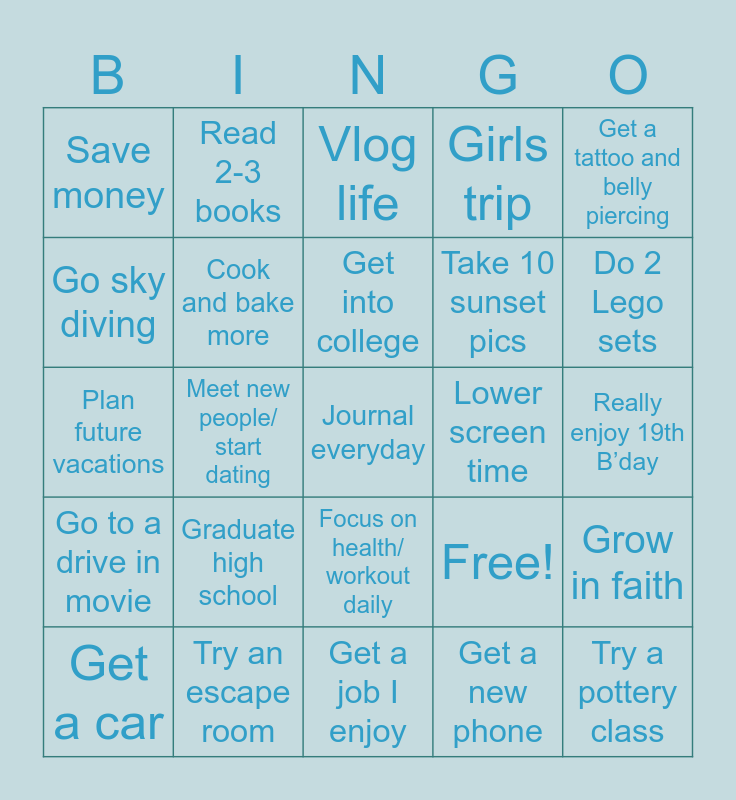 This bingo card has 25 words: Graduate high school, Get a job I enjoy, Get into college, Get a car, Get a tattoo and belly piercing, Save money, Go sky diving, Read 2-3 books, Lower screen time, Focus on health/ workout daily, Take 10 sunset pics, Plan future vacations, Free!, Grow in faith, Cook and bake more, Try a pottery class, Really enjoy 19th B’day, Vlog life, Do 2 Lego sets, Meet new people/ start dating, Journal everyday, Try an escape room, Go to a drive in movie, Girls trip and Get a new phone.