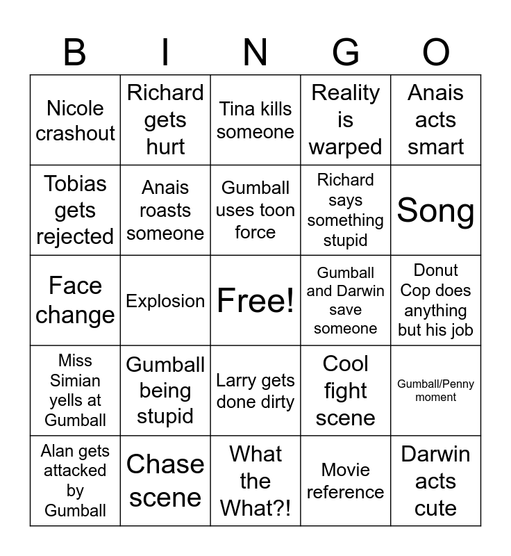 This bingo card has a free space and 24 words: Gumball being stupid, Chase scene, Gumball uses toon force, Alan gets attacked by Gumball, Anais acts smart, Nicole crashout, Tobias gets rejected, Richard gets hurt, Gumball and Darwin save someone, Larry gets done dirty, Richard says something stupid, Face change, Cool fight scene, Gumball/Penny moment, Anais roasts someone, Movie reference, Donut Cop does anything but his job, Tina kills someone, Song, Explosion, Darwin acts cute, Miss Simian yells at Gumball, Reality is warped and What the What?!.