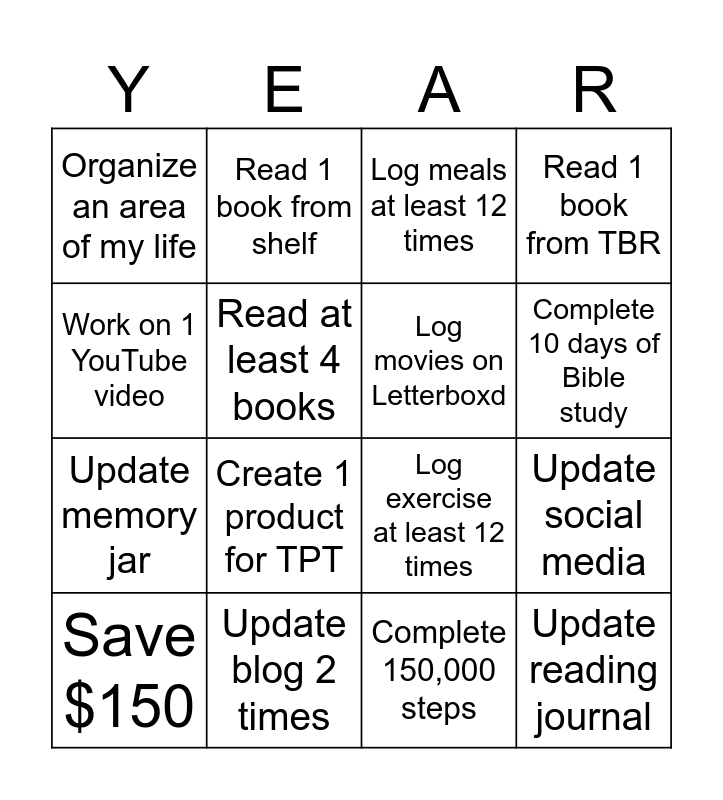 This bingo card has 16 words: Update blog 2 times, Update social media, Log meals at least 12 times, Organize an area of my life, Update memory jar, Read 1 book from shelf, Log exercise at least 12 times, Complete 150,000 steps, Work on 1 YouTube video, Read at least 4 books, Save $150, Read 1 book from TBR, Create 1 product for TPT, Complete 10 days of Bible study, Log movies on Letterboxd and Update reading journal.