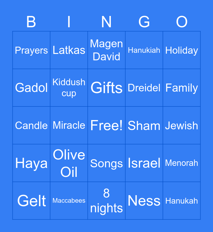 This bingo card has a free space and 28 words: Menorah, Sufganiyot, Dreidel, Ness, Gadol, Magen David, Latkas, Haya, Sham, Gelt, Candle, Hanukiah, Maccabees, 8 nights, Family, Shamash, Olive Oil, Kiddush cup, Gifts, Songs, Prayers, Light, Hanukah, Miracle, Jewish, Israel, Holiday and Blessing.