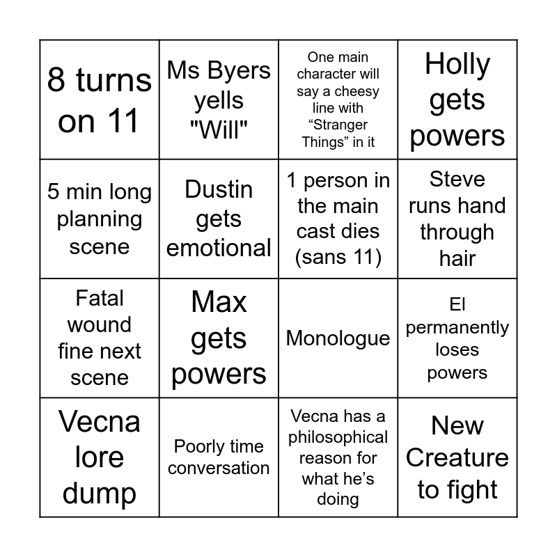 This bingo card has 24 words: Will says "he’s here", Will touches back off neck, Steve runs hand through hair, Goodbye embrace, 5 min long planning scene, 8 turns on 11, Dustin gets emotional, Ms Byers yells "Will", Poorly time conversation, Nancy shoots vecna with no effect, Fatal wound fine next scene, Monologue, Vecna has perfect opportunity to kill and doesn’t, Eleven dies, 1 person in the main cast dies (sans 11), Time skip (more than a year), Vecna has a philosophical reason for what he’s doing, One main character will say a cheesy line with “Stranger Things” in it, Max gets powers, El permanently loses powers, Vecna lore dump, New Creature to fight, Holly gets powers and El dumps Mike.